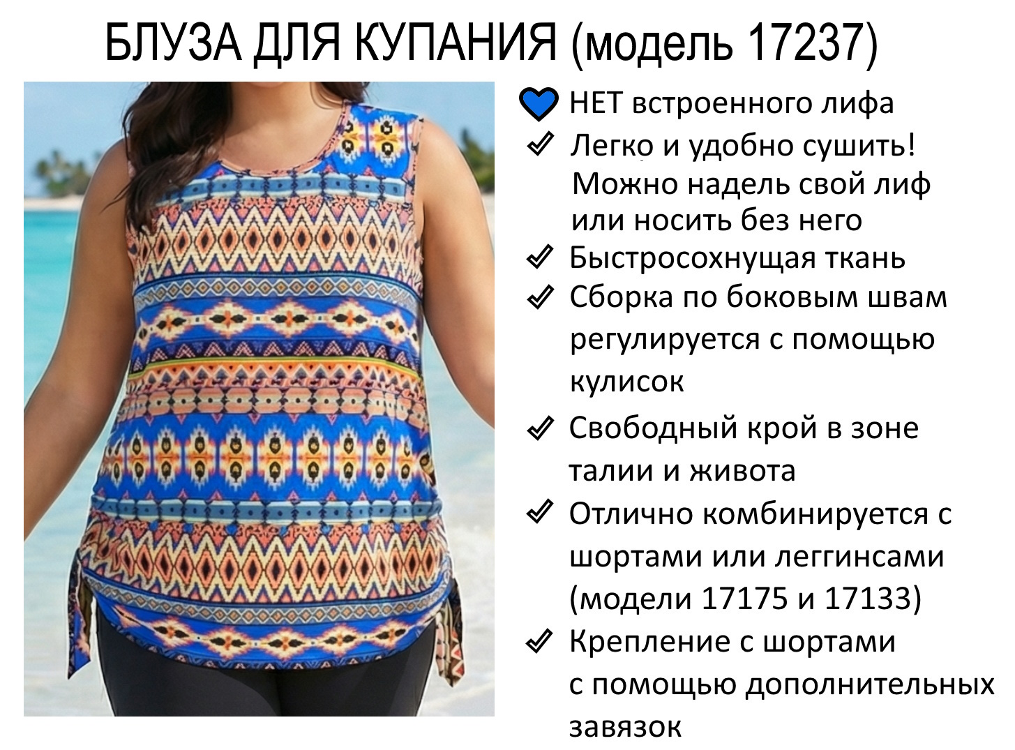 Удлиненный купальный топ свободного кроя с завязками по бокам, позволяющими регулировать посадку по бедрам. Обращаем внимания, что топ не имеет встроенного бюстгальтера. Вниз вы можете надеть любой свой бюстгальтер или купальный лиф.