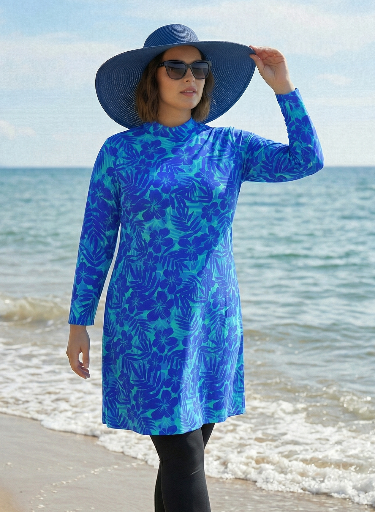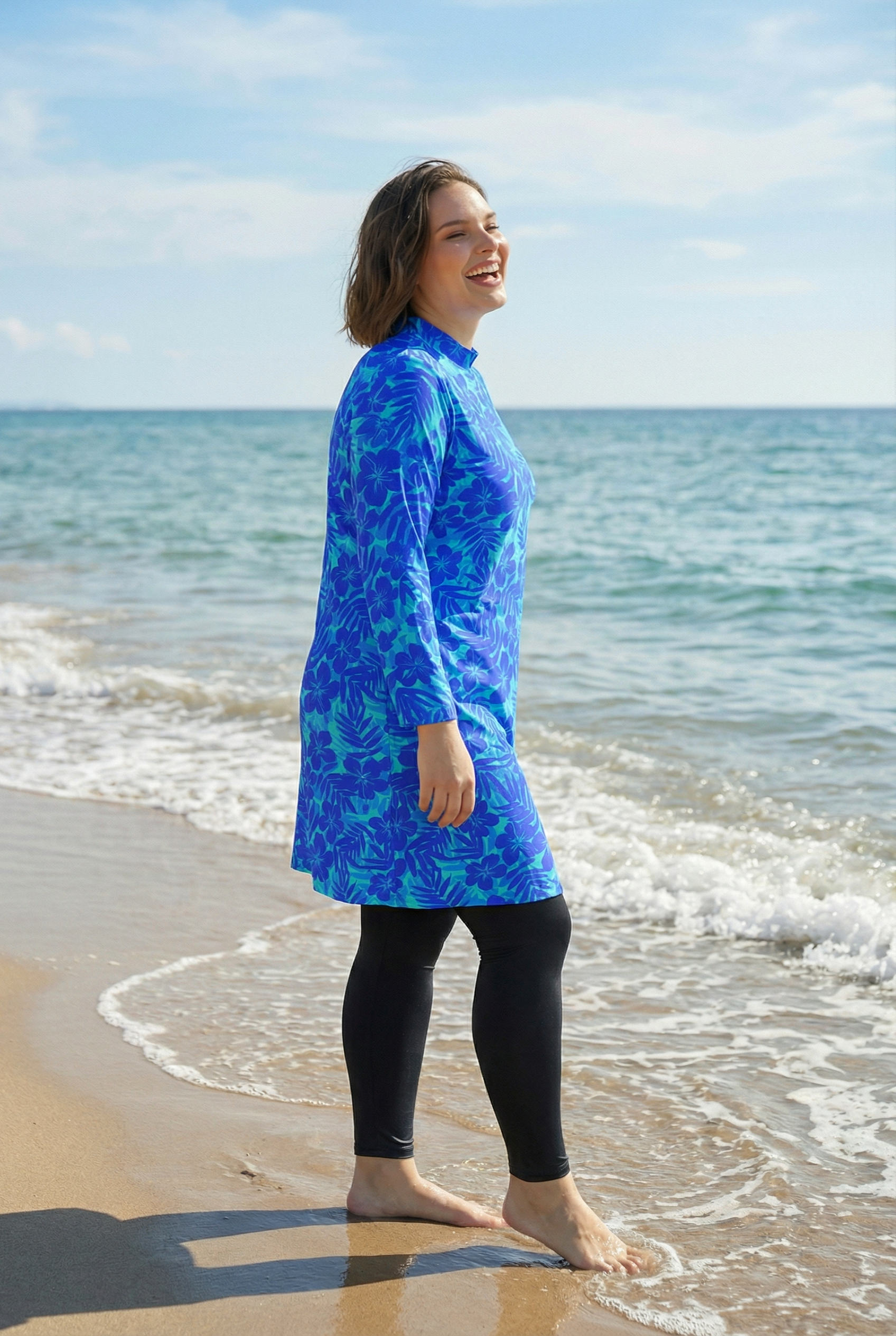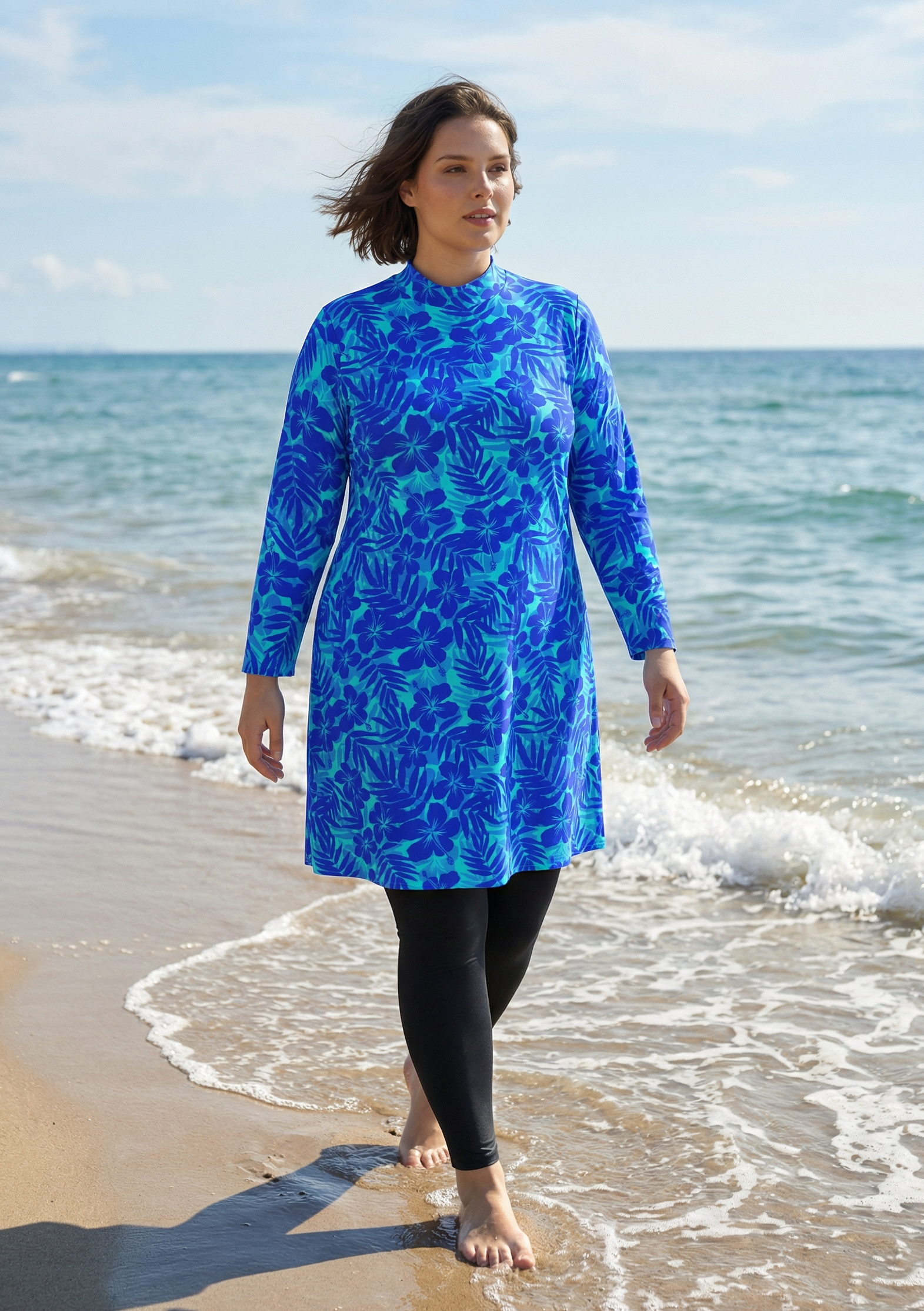 Удлиненный купальный топ-туника с длинными рукавами и воротником-стойка. Обращаем внимание, что топ не имеет встроенного бюстгальтера. Вниз вы можете надеть любой свой бюстгальтер или купальный лиф.